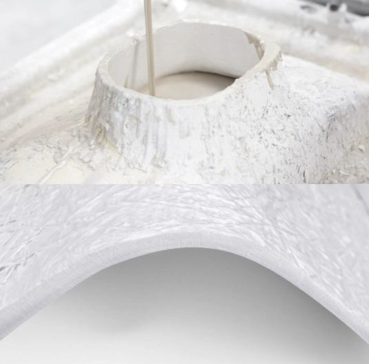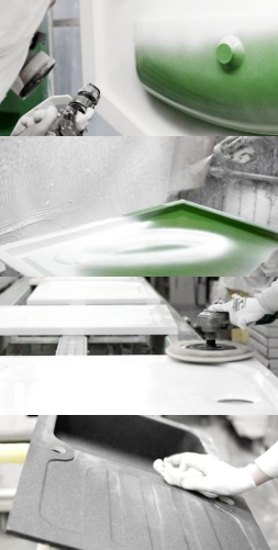 Materiál vyvinutý na báze polyméru získaného z recyklovaného PET a prírodných minerálnych plnív z vápenca a kremeňa. Povrch výrobkov je pokrytý vrstvou gélcoatu, ktorý je zodpovedný za ich hladkosť a lesk. Používame gélcoaty modifikované metylmetakrylátom, ktorý zaručuje najvyššiu odolnosť voči UV žiareniu a agresívnym chemickým vplyvom.
