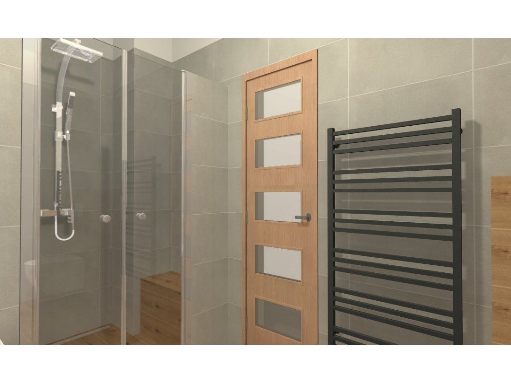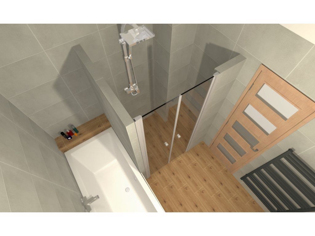 Sprchový kút je obložený dlaždicami a má 80 cm sprchové dvere Andy. Tieto dvere sú veľmi praktické a dajú sa otvárať dovnútra alebo von. Namiesto vane sme umiestnili odtokový žľab. V murovanom sprchovom kúte, v rohu, máme praktické murované sedadlo.