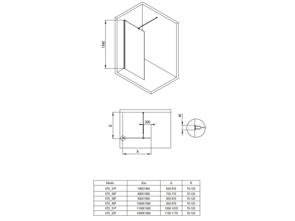 Tabuľka rozmerov sprchového kúta Kerria Plus Walk In