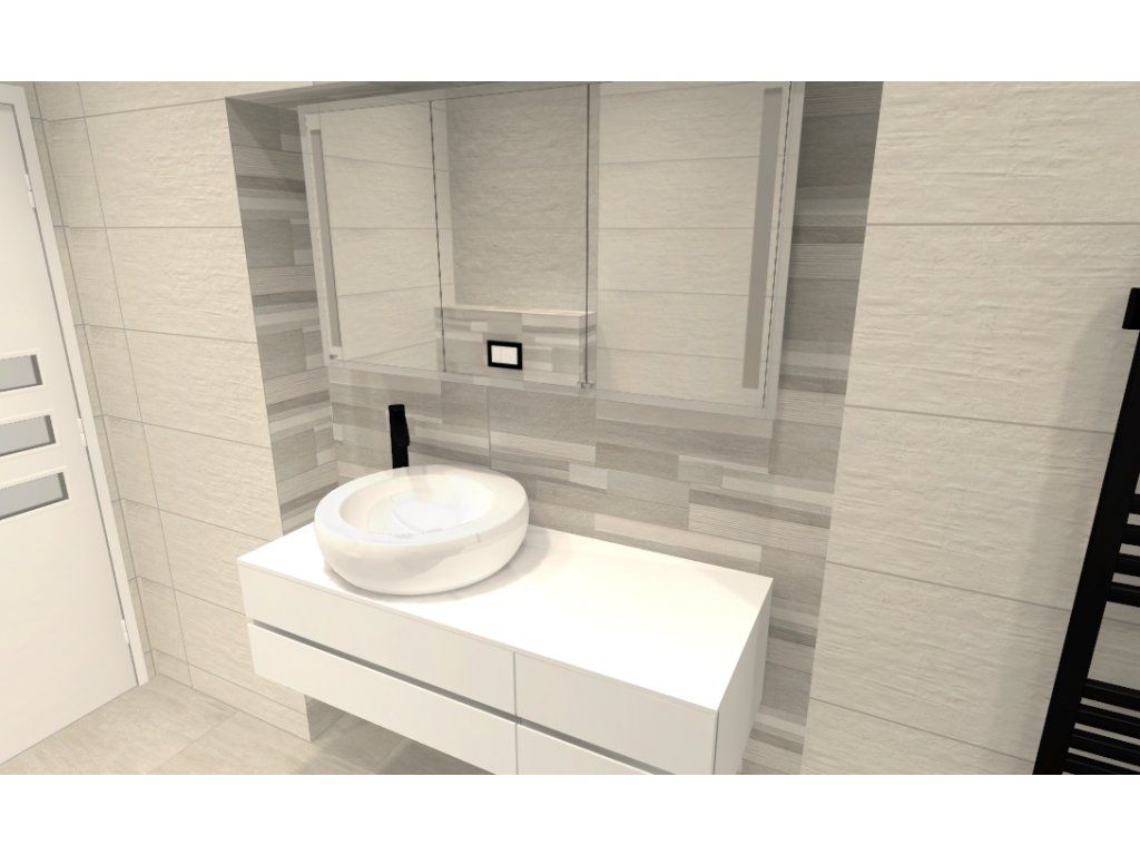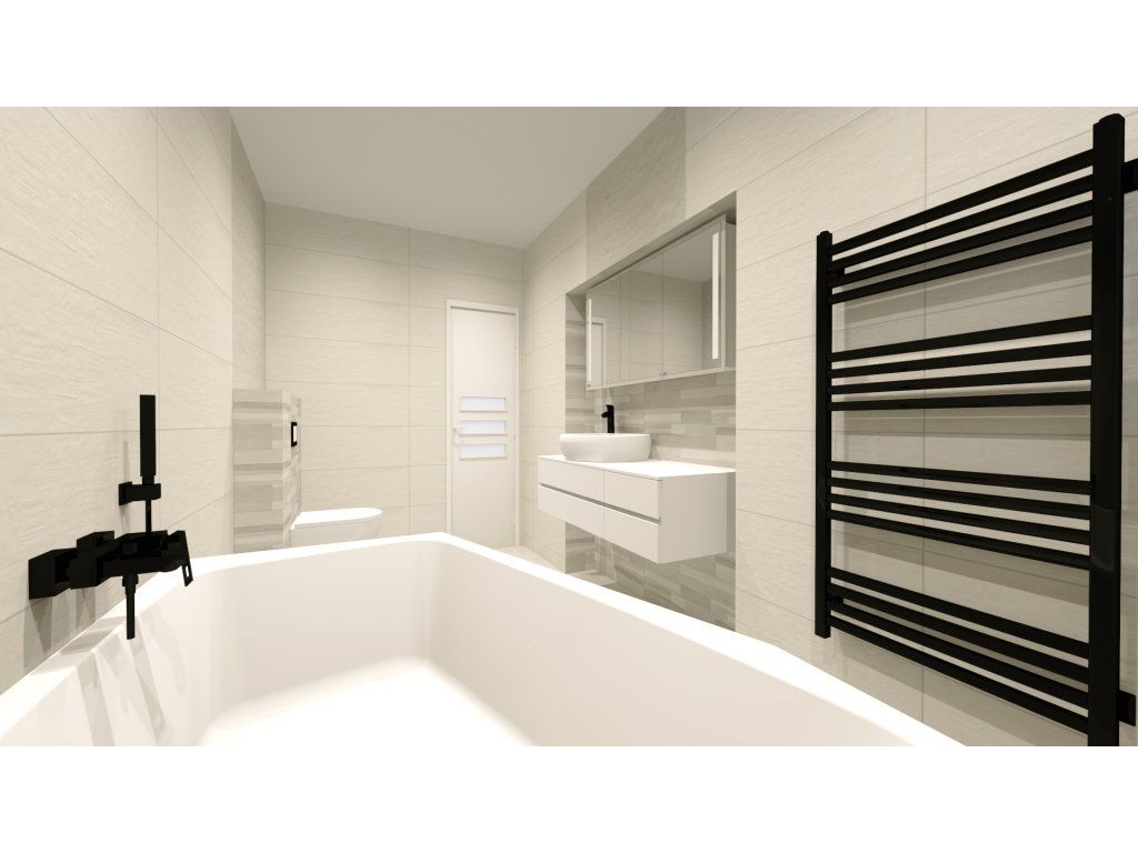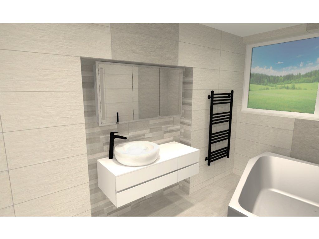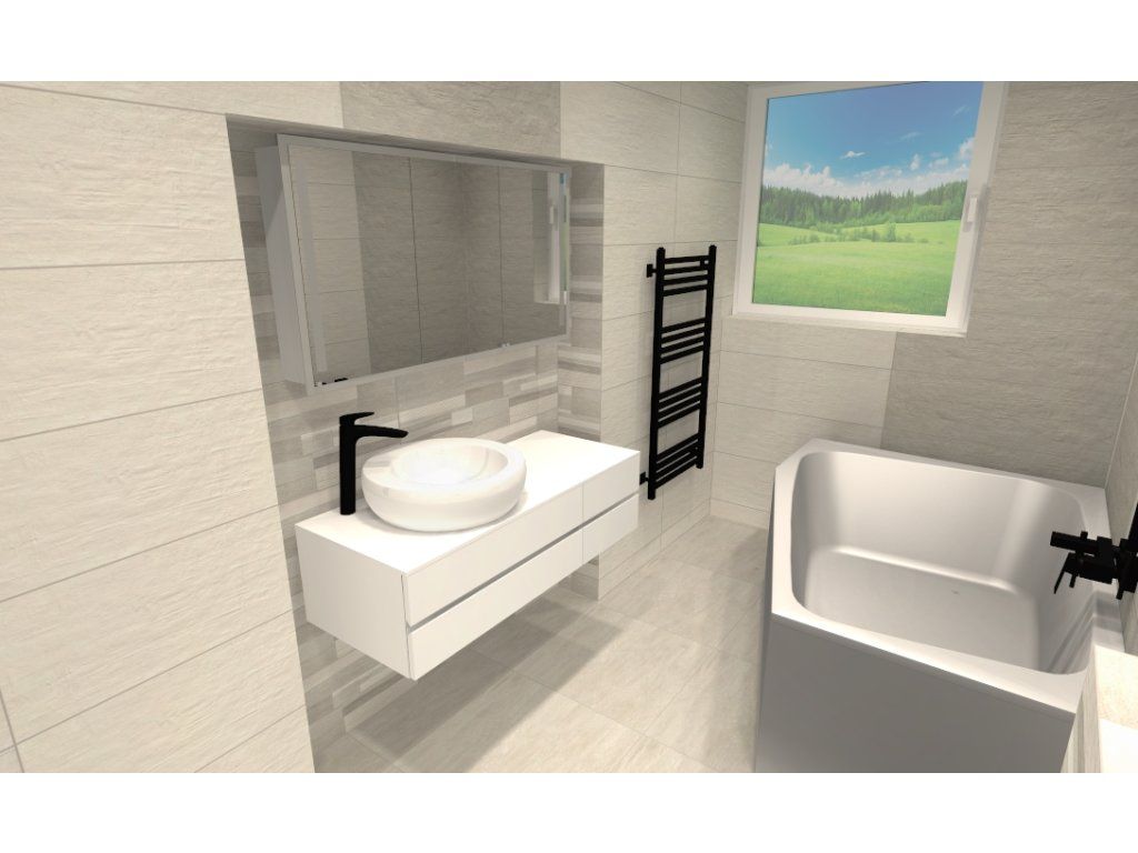 Čo sa týka obloženia kúpeľne, je naozaj veľmi decentné, vkusné a nadčasové, takže zákazníka určite neomrzí ani po niekoľkých rokoch. Kúpeľňa je obložená sériou Canterbury, ktorá kombinuje bielu a sivú farbu, a to všetko dopĺňa kamenný dekor a vyniká najmä rozmerom obkladačiek 90x60 cm a nezameniteľnou štruktúrou obkladačiek.