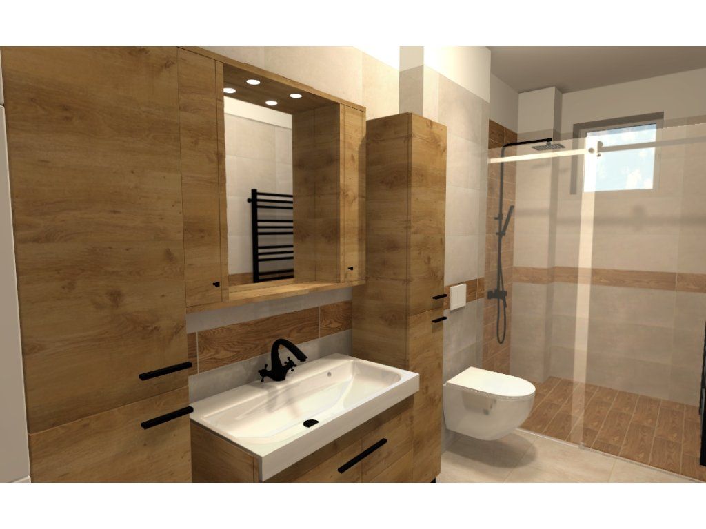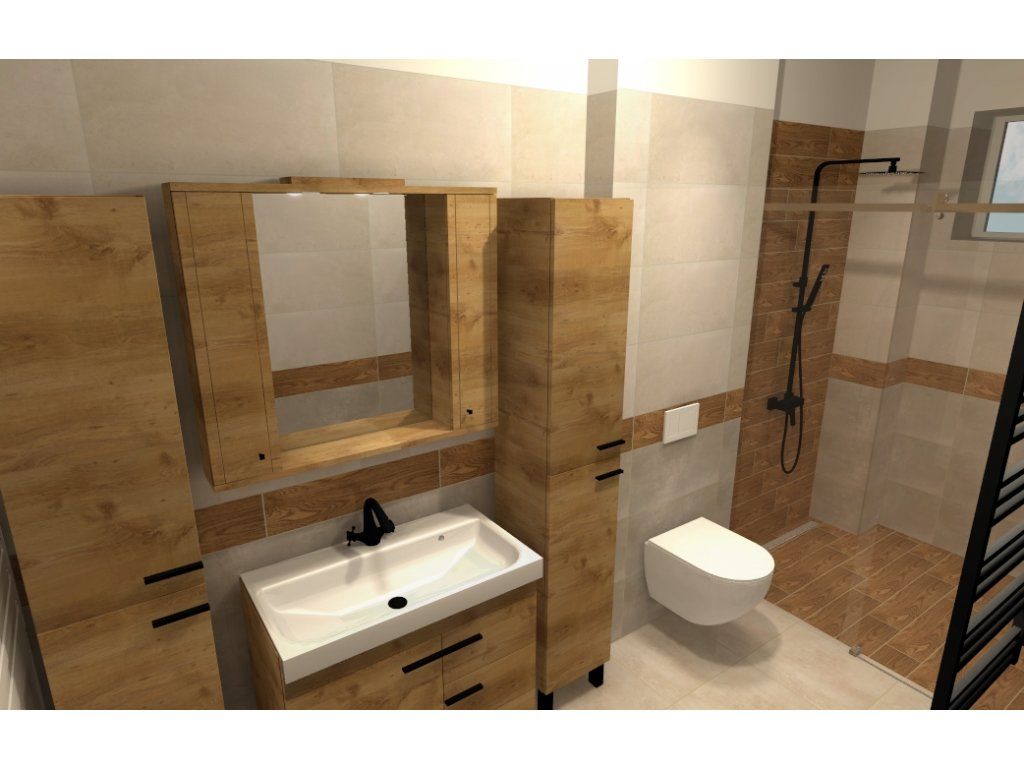 Keďže vstupné dvere sa nachádzajú veľmi vľavo od kúpeľne, bolo potrebné umiestniť všetko vybavenie na pravej strane. Na usporiadaní to však nič nemení, pretože všetko opticky vyvažuje spomínaný sprchovací kút na konci kúpeľne. Ten bol vytvorený pomocou úžasných sprchových dverí Hyacint so šírkou 140 cm s jedinečným pohyblivým systémom zavesenia skla.