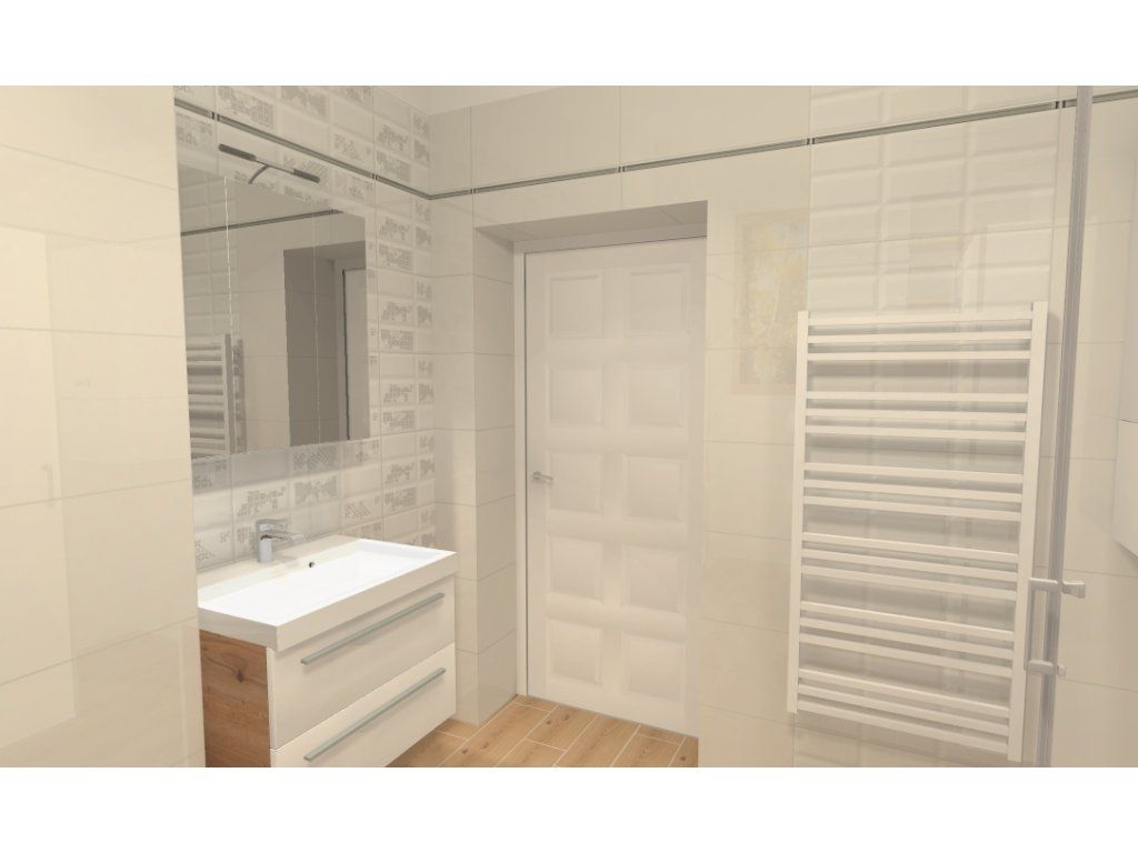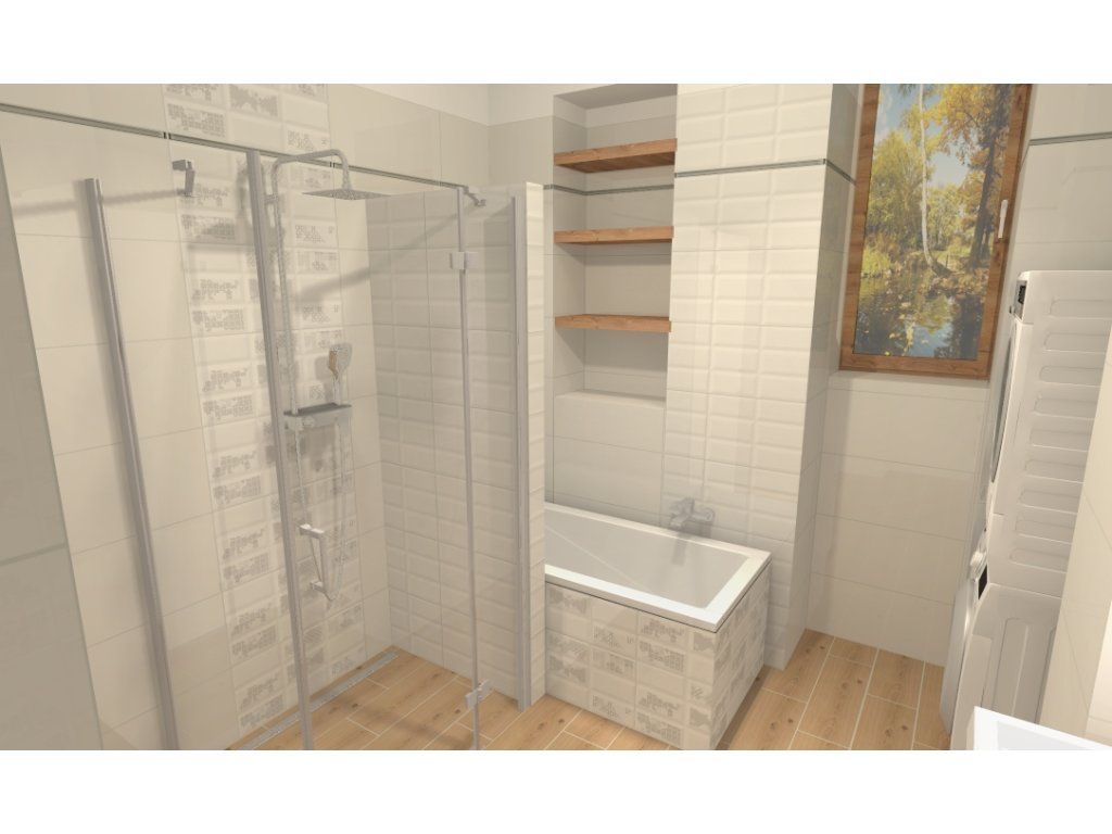 Čo sa týka obloženia kúpeľne, je obložené naozaj veľmi decentne, vkusne a nadčasovo, takže zákazníka určite neomrzí ani po niekoľkých rokoch. Kúpeľňa je obložená sériou Naris, ktorá kombinuje vkusný dekor dreva s bielym lesklým obkladom vo formáte 60x30, dekorom s jemnými striebornošedými vzormi, reliéfnym dekorom "buchiet" a striebornošedou tenkou lištou.