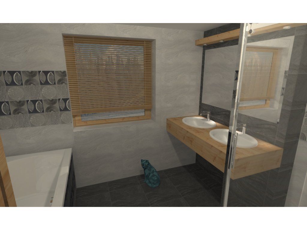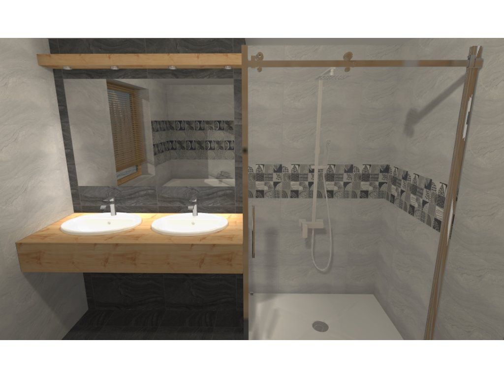 So zákazníkom sme dlho hľadali kombináciu vhodných sivých dlaždíc vo väčšom formáte a myslíme si, že toto bola správna voľba. Rozmiestnenie zariaďovacích predmetov v kúpeľni je dielom architekta, ktorý nenechal žiadny priestor nevyužitý, takže v kúpeľni je dostatok úložného priestoru a tiež preto, aby kúpeľňa mohla mať drevenú dosku so zapusteným umývadlom. Tento kútik s umývadlom sme doplnili o zaujímavú svetelnú rampu v rovnakom drevenom dekore.