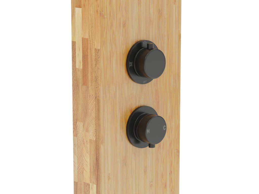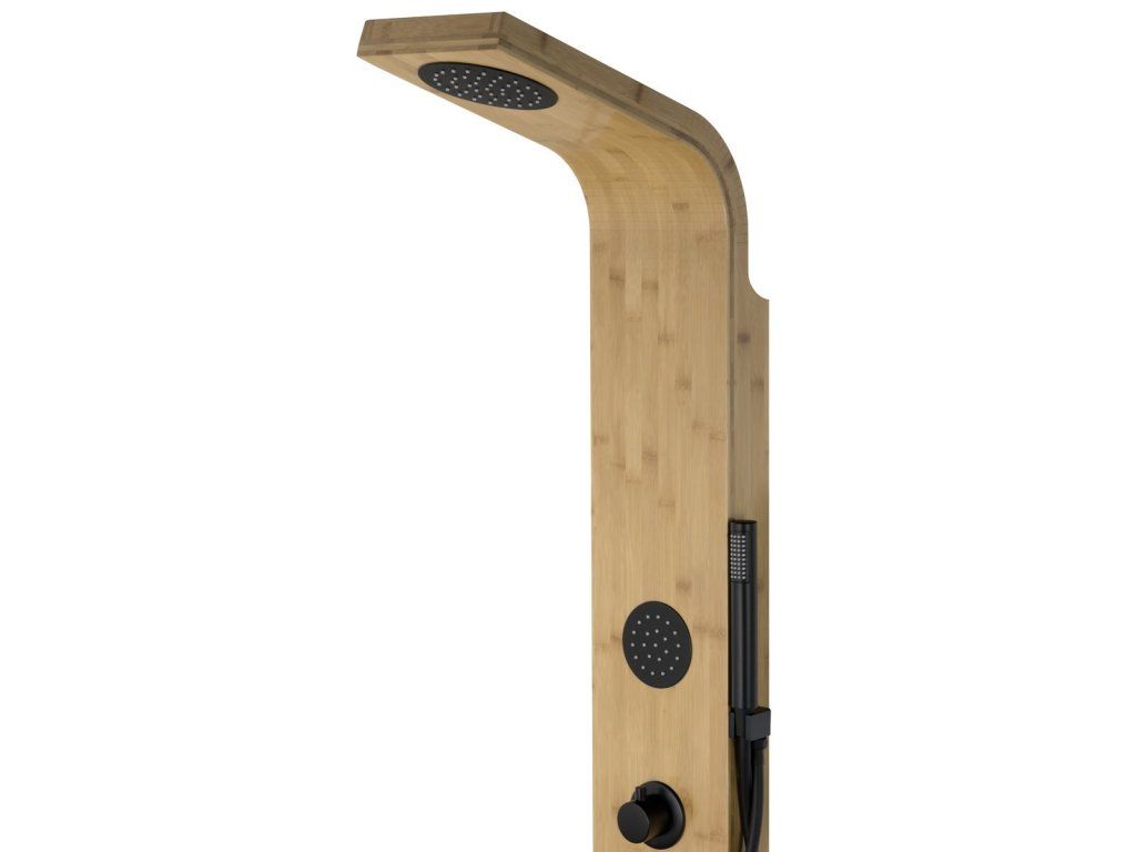 - dizajnový sprchový masážny panel v drevenom dizajne s čiernymi detailmi