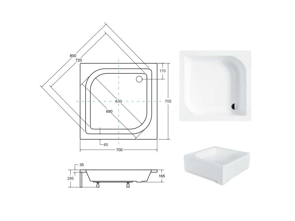 Veľmi praktická a kvalitná štvorcová sprchová vanička, vyrobená z kvalitného sanitárneho akrylátu (vystuženého živicou).